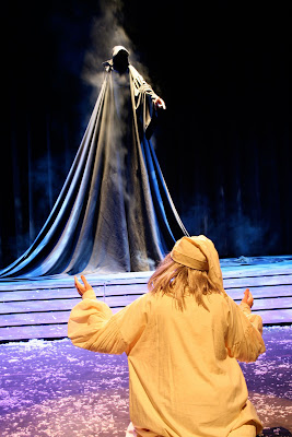 The most frightening and powerful of all of the spirits, however, was also the most silent. Pacella, as Future, spoke no words. Suspended high above the stage and clad in flowing black robes, Pacella simply pointed out Scrooge’s grim future with skeletal hands.